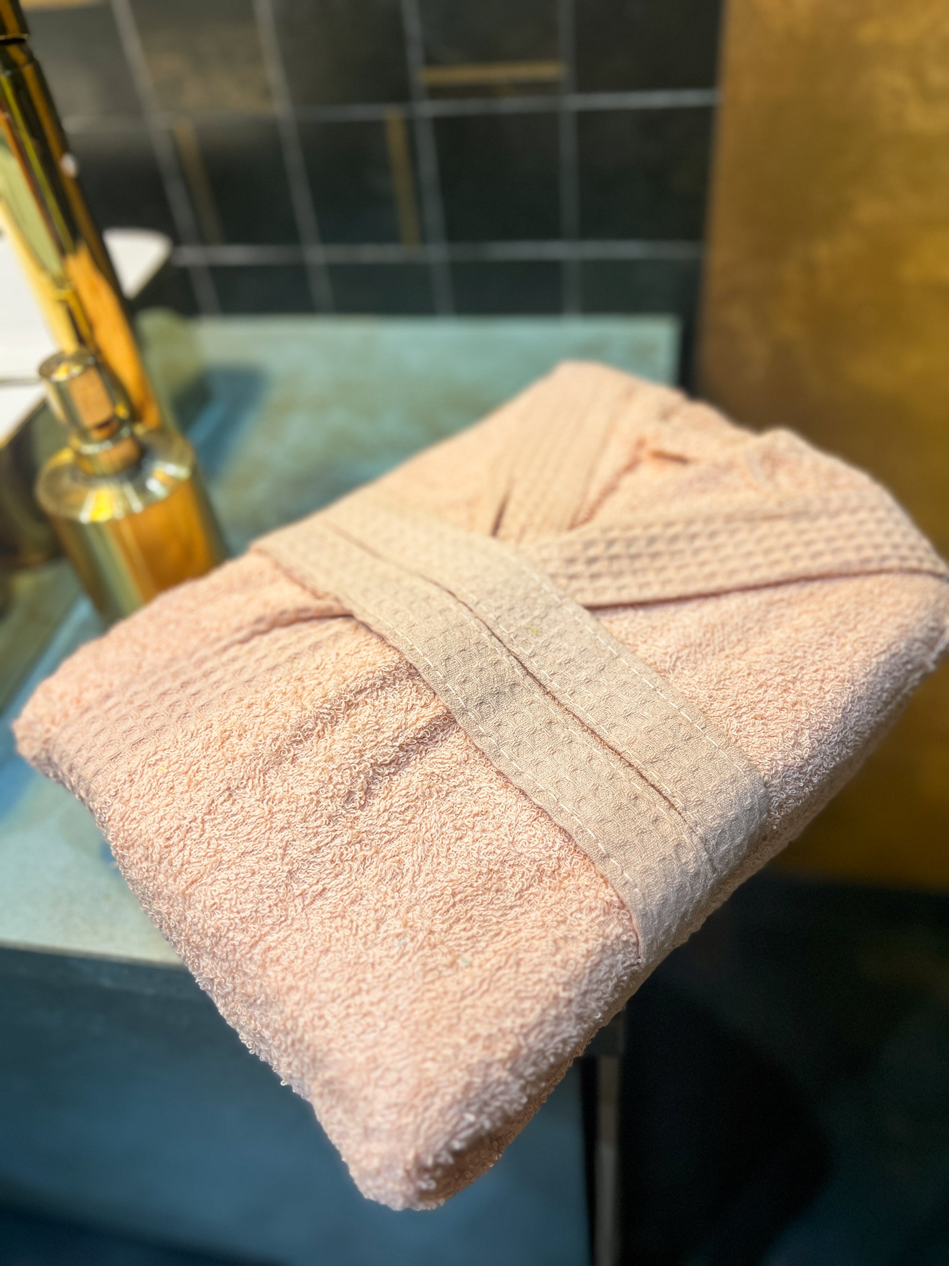 Ērts un praktisks frotē halāts ar unisex piegriezumu, piemērots gan sievietēm, gan vīriešiem. Izgatavots no mīksta un labi mitrumu uzsūcoša auduma, kas sniedz patīkamu sajūtu pēc vannas, dušas vai pirts.